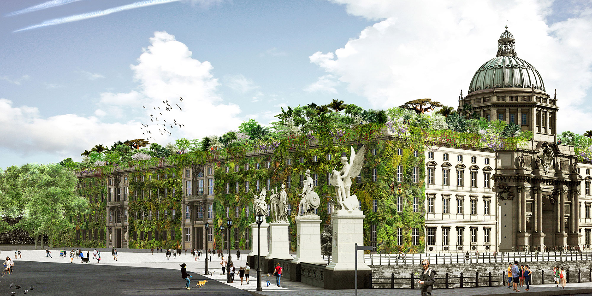 Projekt „Humboldt Dschungel“ von Hybrid Space Lab in Zusammenarbeit mit Uta Belkius und Notker Schweikhardt Grüne Fassade: © Hybrid Space Lab – Originalbild: © Stiftung Berliner Schloss – Humboldtforum / Architekt: Franco Stella mit FS HUF PG